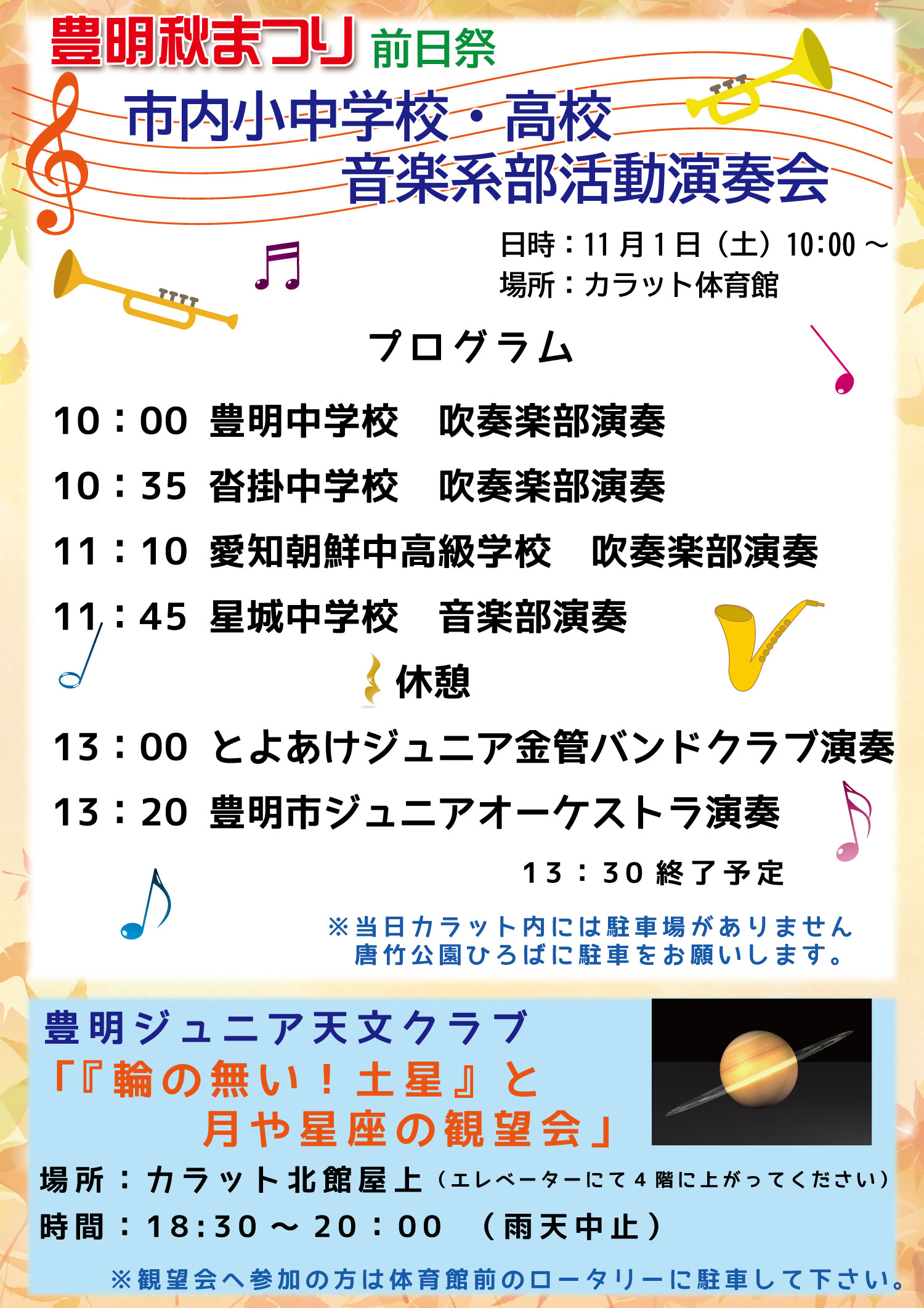 内容:市内小中学校・高校音楽系部活動演奏会(体育館)10:00~13:30
